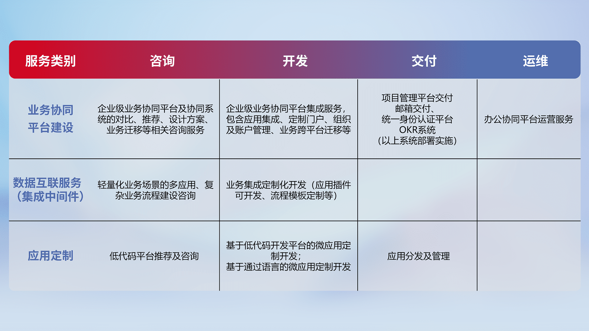 针对钉钉、、企微、、、IDaas等平台级产品提供产品的规划、、、、方案、、、、交付、、、定制化开发等服务,,,实现如统一协同办公、、、智能客户服务、、、、混合会议管理、、智能数据查询、、等业务场景,,实现数字化转型。。。。